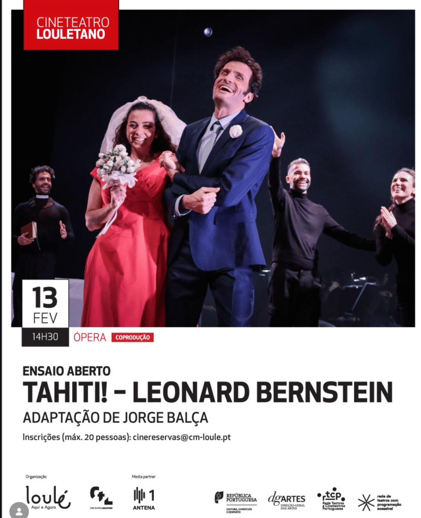 Staged by Jorge Balça and conducted by Maestro Pablo Urbina, Tahiti! brings together two operas: Pacific Pleasures (2016–17) by Alannah Marie Halay and Trouble in Tahiti (1952) by Leonard Bernstein. The performance features five classical singers — Inês Constantino (mezzo-soprano), Leonel Pinheiro (tenor), Ricardo Panela (baritone), Rui Baeta (baritone), and Sofia Marafona (soprano) — alongside puppeteers Ana Rebelo and Luís Godinho / S.A. Marionetas, with the Orquestra do Algarve.
